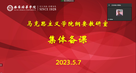2023年5月7日,西安培华学院马克思主义学院中国近现代史纲要教研室针对审核评估期间教学内容开展线上集体备课活动。会议由纲要教研室主任鲁文英老师主持,教研室全体教师参加。