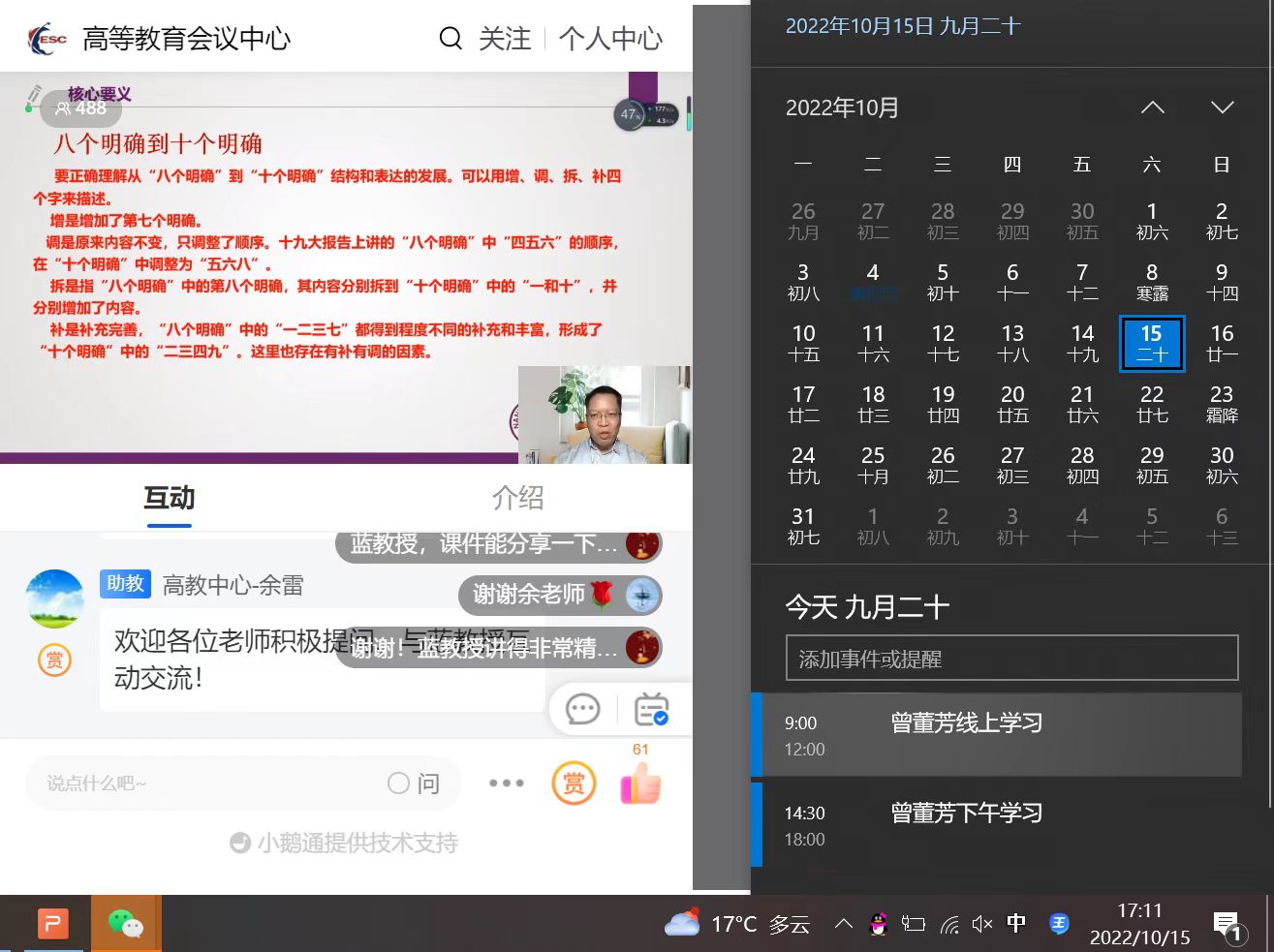 为助力我校《习近平新时代中国特色社会主义思想概论》课程教学工作更好开展,帮助广大教师解决课程开设和教学中遇到的难题与困惑,2022年10月15日和17日,马克思主义学院组织习近平新时代中国特色社会主义思想概论教研室全体成员参与了由高等教育会议中心主办的《习近平新时代中国特色社会主义思想概论》课程开设与教学辅导的三场线上培训课程。