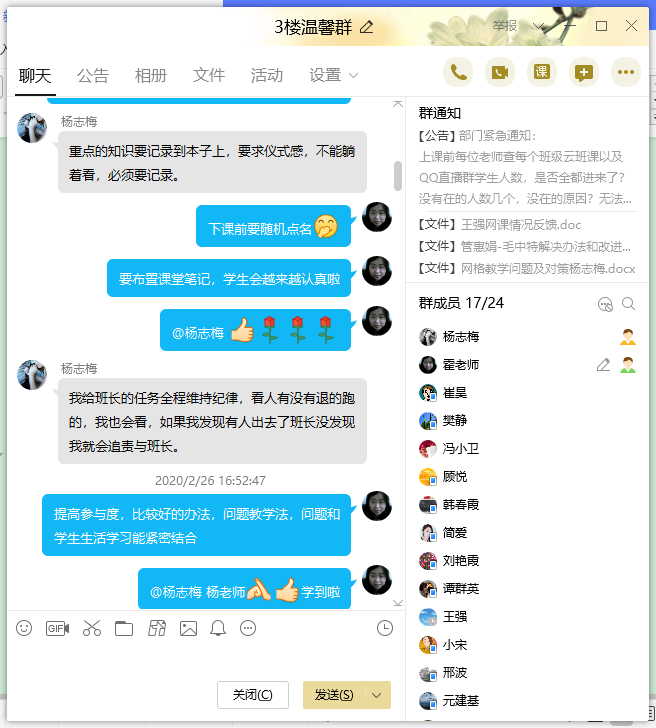 2月初我自己了解各种直播工具,考虑学生实际情况,选择了不需要安装APP软件、不占据学生手机内存的QQ群进行直播教学,并配合学生早已安装的云班课APP进行线上混合式教学。