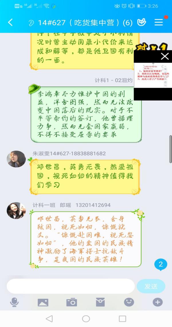 同学们,很高兴成为你们青春同路人!你每一次的学习参与,都是你学习能力的提升。你们在直播课堂的每一次语音文字发言、每一次小组讨论、云班课的每一次学习和思考,每一点学习都会记录下你的收获!老师我会用心的记录下每一堂课每一个同学的学习提升,细致的记录下你们的成长:话说历史、小组讨论截图、小组代表发言、文字发言、网卡学生课后沟通记录......