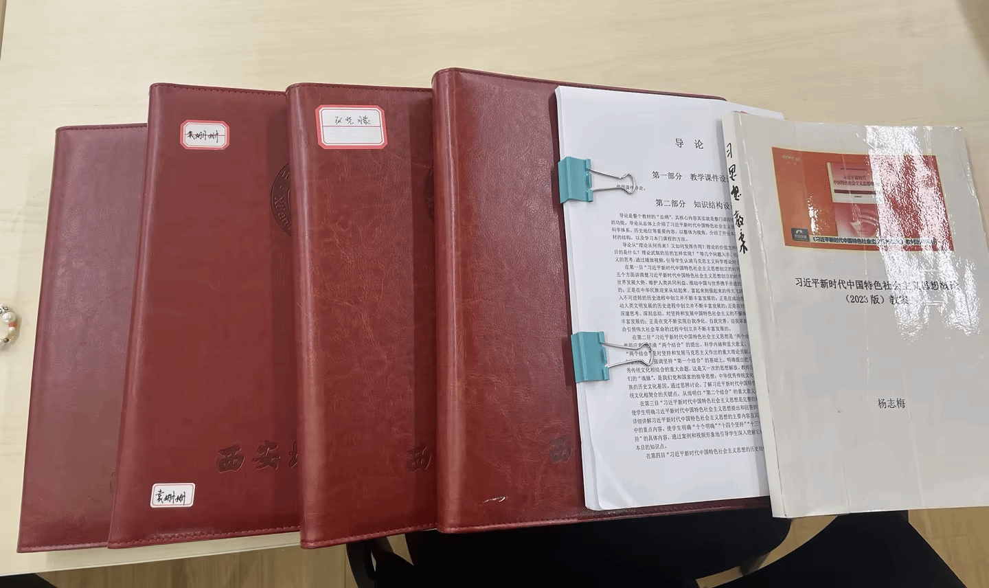 会议伊始,杨志梅主任强调,思政课是铸魂育人的关键课程,教学准备工作直接关系课堂教学质量。随后,教研室对全体教师的新学期教案进行集中检查,重点核查教学目标是否明确、教学内容是否贴合党的最新理论成果、教学方法是否创新多样、案例素材是否鲜活贴切。检查发现,教师们均已完成新学期全部课程教案撰写,内容涵盖 “中国式现代化”“改革攻坚” 等核心主题,融入 “中国智造”“乡村振兴” 等实践案例,部分教案还设计了情景互动、小组讨论等特色环节,整体准备充分、质量达标。