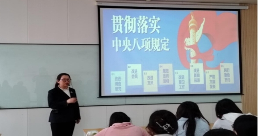 学习教育启动以来,马克思主义学院精心谋划,系统推进,第一时间召开由党政领导班子、支部负责人、教研室主任、行政办公室主管人员以及负责党务工作的人员参加的学习动员部署会。坚持个人自学、领导领学、集中研学、实践教学为一体,原原本本传达学习《习近平关于加强党的作风建设论述摘编》《八项规定改变中国》《党的十八大以来深入贯彻中央八项规定精神的成效和经验》等内容.通过召开专题学习会、举办专题辅导报告会、参观廉政教育基地等多种形式进行学习研讨,做到“关键少数”带动“绝大多数”,充分发挥“头雁效应”。在全面落实学习教育各项工作安排的基础上,学院党总支举办了学习教育读书班,深入研读习近平总书记就贯彻落实中央八项规定精神发表的重要讲话,围绕立德树人根本任务,联系实际进行交流研讨,做到学深一步、悟深一层。把《习近平新时代中国特色社会主义思想概论》和中央八项规定及其实施细则精神纳入党委理论学习中心组“第一议题”,思政课教学“首要内容”,进入教材、进入课堂、进入活动、进入网络、进入师生思想。邀请校党委刘锋书记以“八项规定改变中国”为主题,为会计、护理专业班的青年大学生上了一堂严肃而生动的思政课。召开党外人士座谈会,传达学习习近平总书记在中共中央党外人士座谈会上的重要讲话精神,领学了党的十八大以来深入贯彻中央八项规定精神学习教育的成效经验。各基层党组织还依托“三会一课”、主题党日,紧扣中央八项规定及其实施细则精神要求,组织教师党员、教职工党员、学生党员等,紧密联系个人思想、工作学习实际,主动查摆存在的问题和不足,将学习教育成果转化为改进工作作风和提升教书育人能力的具体实践。