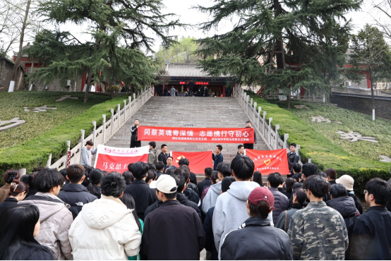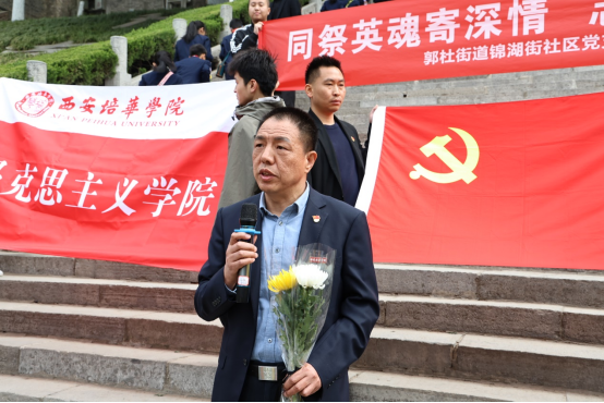 天地英雄气,千秋尚凛然。初春的杨虎城将军烈士陵园内,苍松翠柏,庄严肃穆。上午10时许,祭英烈活动开始,全体人员整齐列队,在杨虎城烈士纪念碑前敬献花篮,肃立静默,共同向革命先烈默哀致敬并郑重地向烈士纪念碑行三鞠躬礼。马克思主义学院党总支书记寇军强结合杨虎城将军生平,现场讲授微党课。他特别强调:“我们不仅是历史的凭吊者,更是使命的传承人。作为新时代青年,要在党史学习中坚定理想信念,在红色基因里厚植家国情怀,将个人成长融入民族复兴的壮阔征程。”