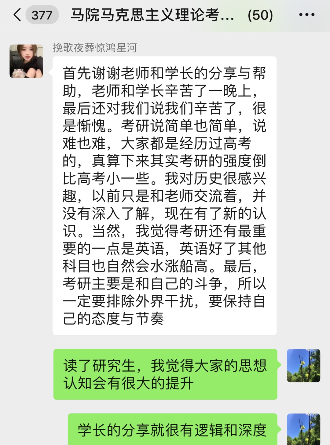 分享会持续了一个多小时,大家对考研的相关话题讨论不断,并建议下一次为大家邀请汉语言专业的考生进行分享。樊老师也及时回复大家,尽量满足各位同学的需求,解决大家的专业困惑,马院会再接再厉把活动办的更好。