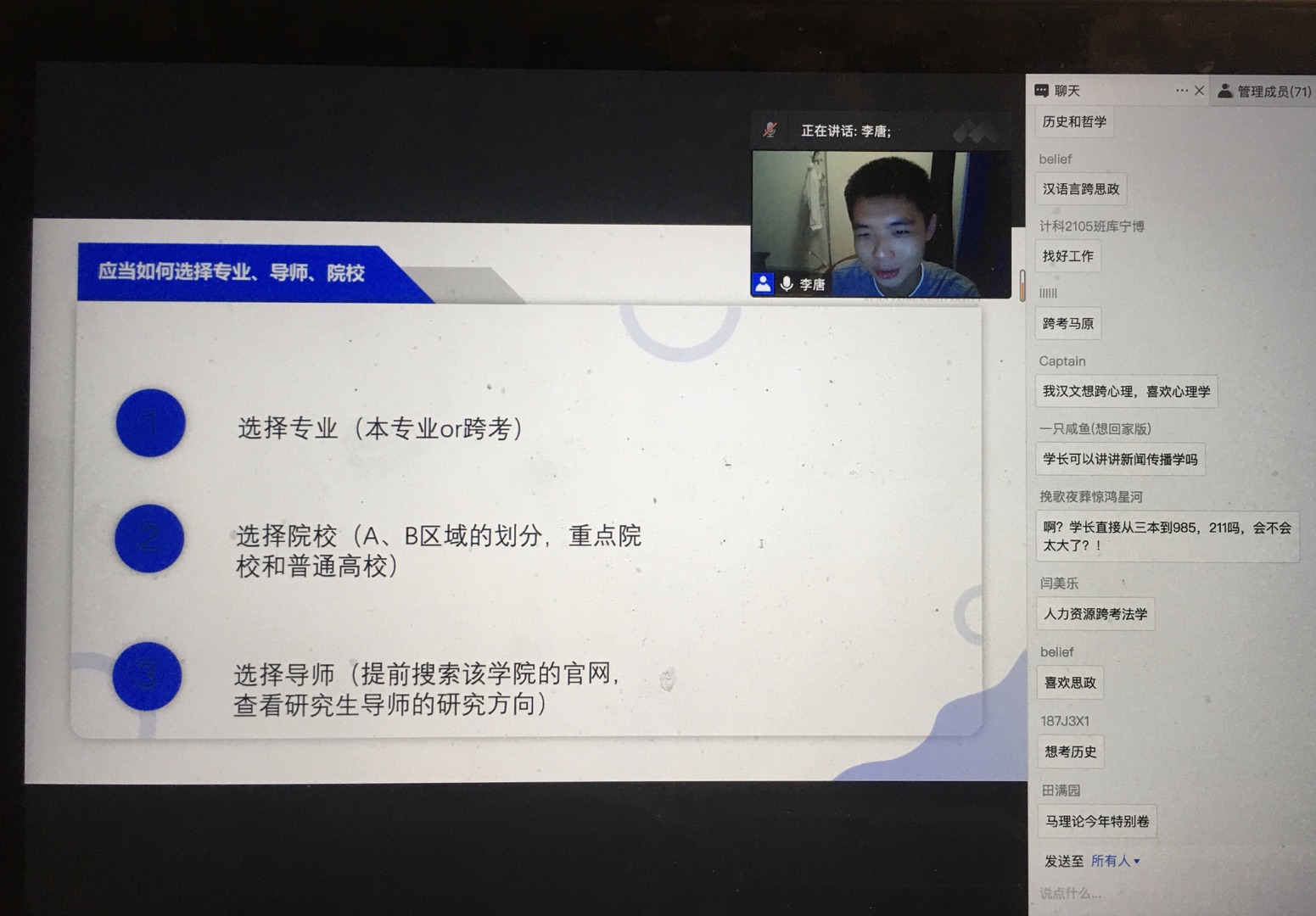 互动环节里,学生们积极提问,李唐学长采用在线聊天的方式及时回答了学生们关于考研方面的各种困惑,解答的过程发现想考马克思主义理论方面研究生的学生相对多一些,在李唐学长的倡议下,樊老师现场为学生建了交流群,会后学生在群里积极分享了本次学习的心得。