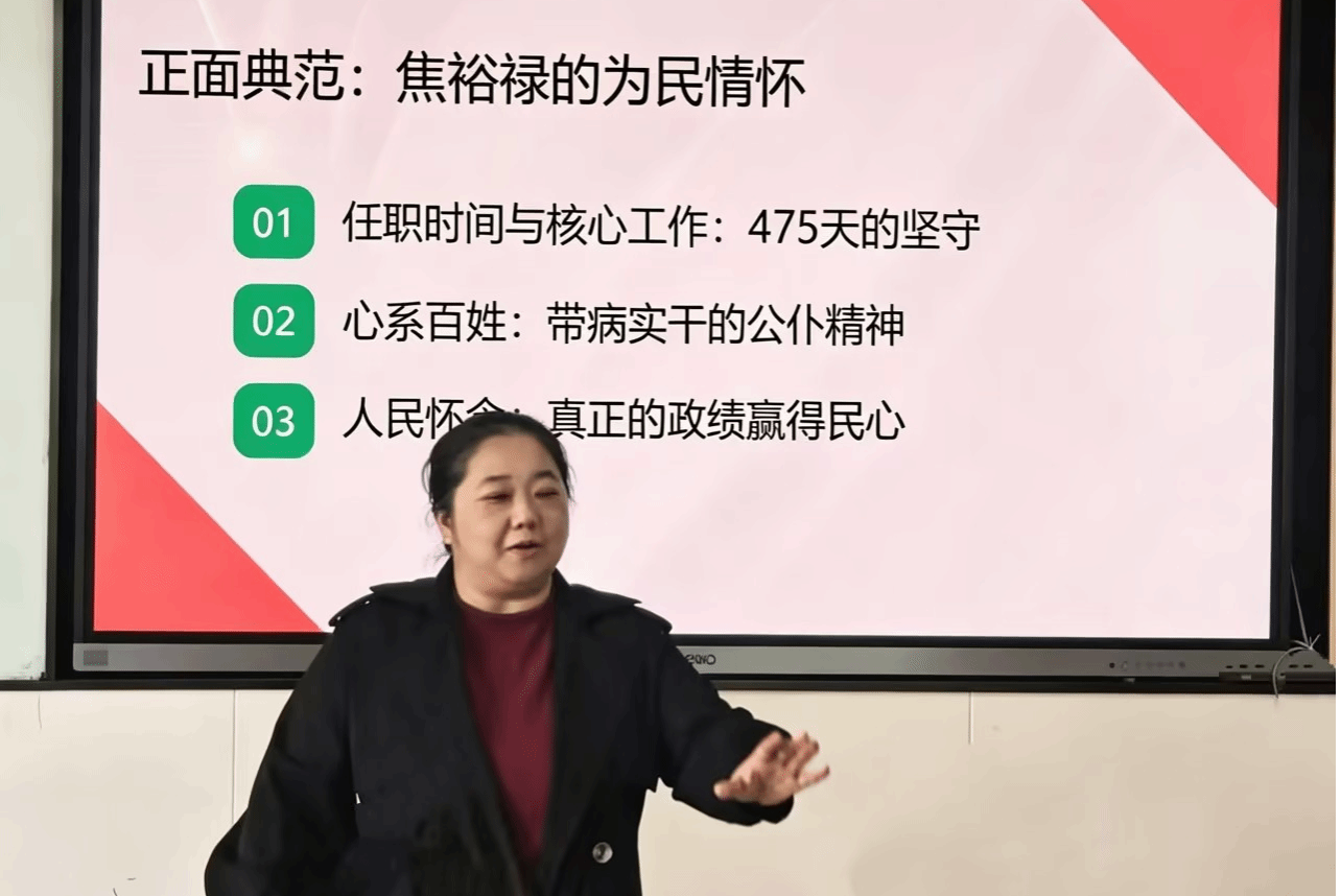 三是怎样做出人民满意的政绩。提出四点实践要求:心中始终装着人民,解决“为了谁”的问题;行动脚踏实地,解决“怎么干”的问题;评价让群众当裁判,解决“谁说了算”的问题;作风清正廉洁,解决“站得正”的问题。通过县委书记政绩观错位被查处的反面案例与焦裕禄扎根兰考为民造福的正面典型,以案为鉴、以事明理,引导党员干部知敬畏、明方向、守初心。
