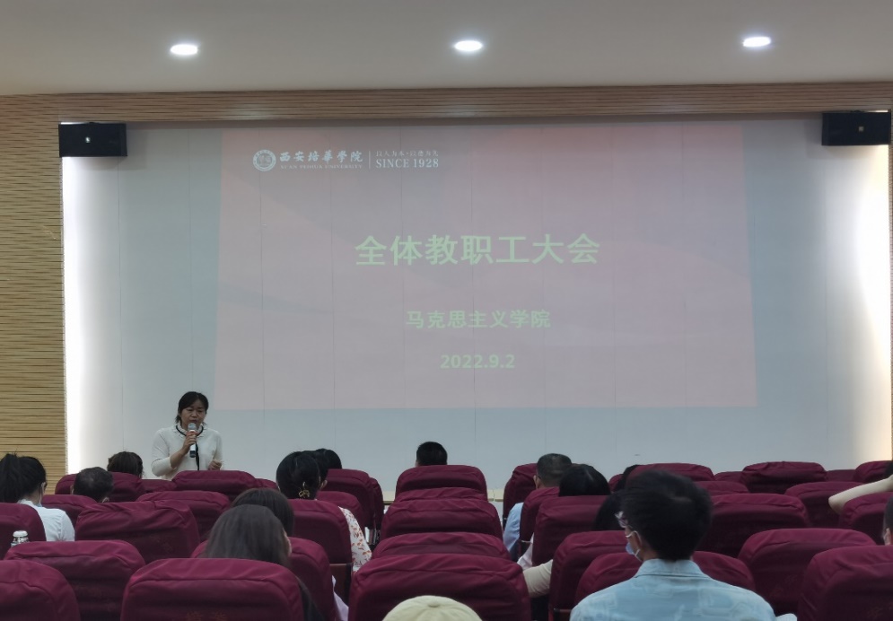2022年9月2日下午,马克思主义学院全员大会在博远楼J201顺利召开。马克思主义学院副院长霍艾湘教授对第一周的《马克思主义基本原理》课程线上教学工作给予了高度肯定,同时对课堂教学、集体备课、青年教师指导等工作提出了进一步的目标和要求,以更好地提升教学质量,促进青年教师的快速成长。