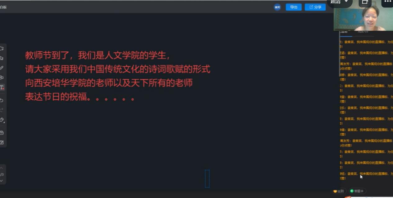 袁秦英老师组织学生采用诗词歌赋的形式表达教师节节日祝福。