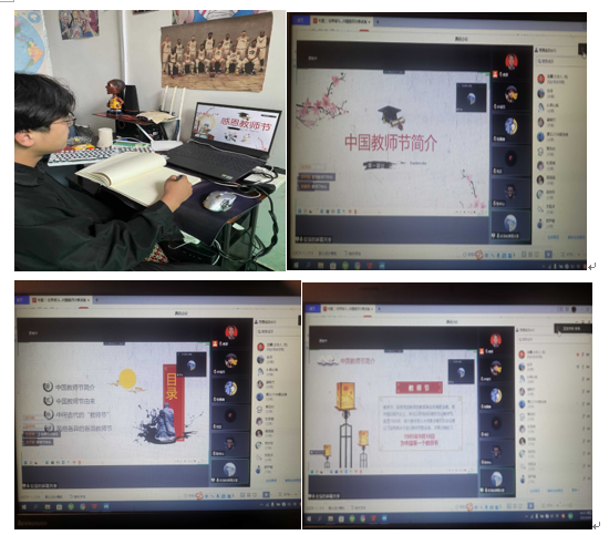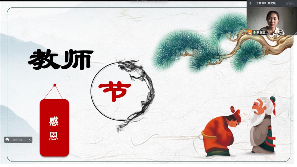 毕静烨子老师组织主题为“感谢师恩,共度佳节”的教师节互动活动。与学生在腾讯会议中进行交流互动,培养了学生尊敬师长和爱国的精神,让他们认识教师在社会主义现代化建设中做出的巨大贡献,感悟到教师无私奉献的高尚师德。