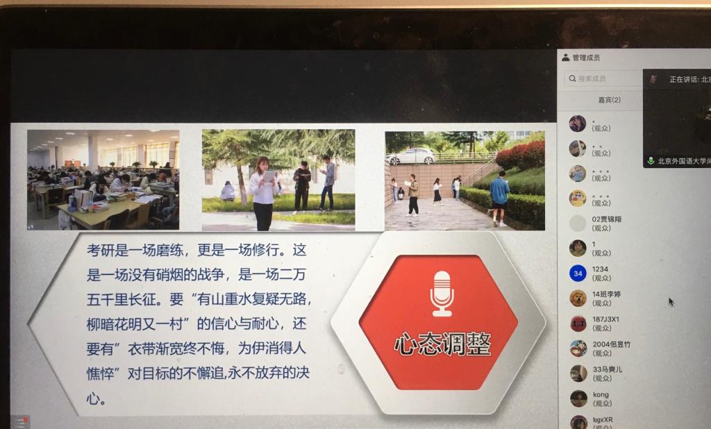 5月11日晚7点20,马院在线上开展了“研”途有梦云分享公益活动第三期。本期考研云分享会邀请到了我校建筑艺术学院工程造价系2018级学生尚庭宇,马院学生社团——青年行研学社、历史与文化协会等60多名师生参与了此次分享会。本次分享会的主题是:背水一战,不留退路才有出路----一战三跨上岸北京外国语大学国际关系与外交学院。