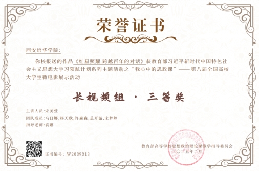 2024年12月,由教育部高校思想政治理论课教学指导委员会主办的第八届“我心中的思政课”全国高校大学生微电影展示活动圆满落幕。西安培华学院马克思主义学院袁娜老师指导的学生团队凭借作品《红星照耀 跨越百年的对话》在长视频组中荣获全国三等奖。此次获奖不仅展现了西安培华学院在思政教育教学改革中的创新成果,也彰显了培华学子对思政课的深刻理解与生动实践。
