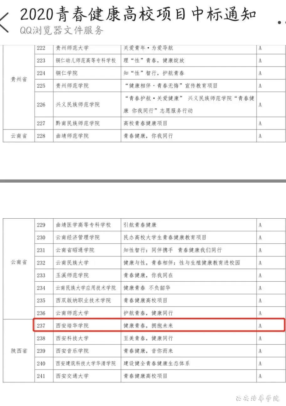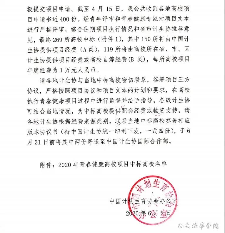 由中国计生协印发的《关于2020年青春健康高校项目招标中标结果的通知》,由我校禁毒防艾社联合青年志愿者联合会共同申报的“青春健康高校项目”,我校以陕西省推荐排序第一名的成绩被中国计生协确立为国家级A类项目,年资助金额1万元,这是我校在这一领域国家级成果的新突破。