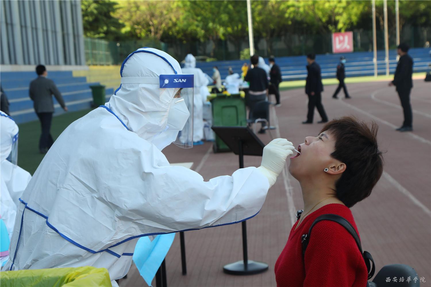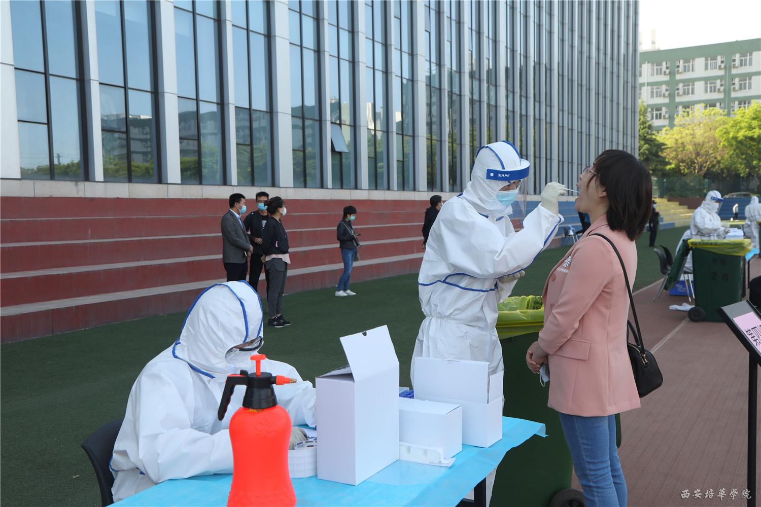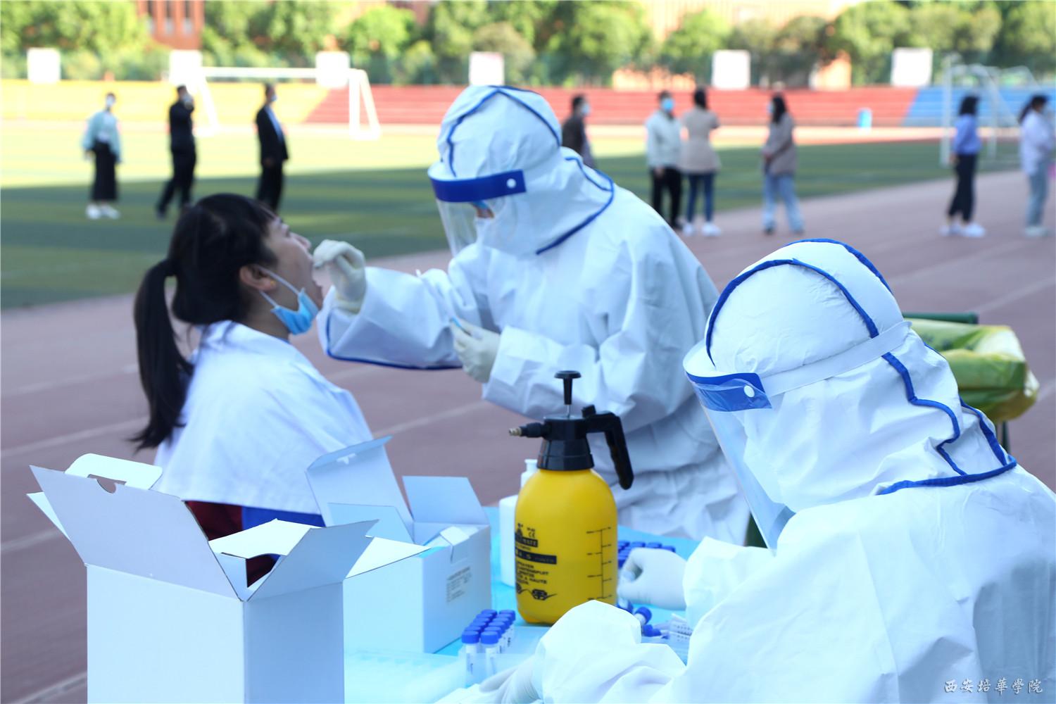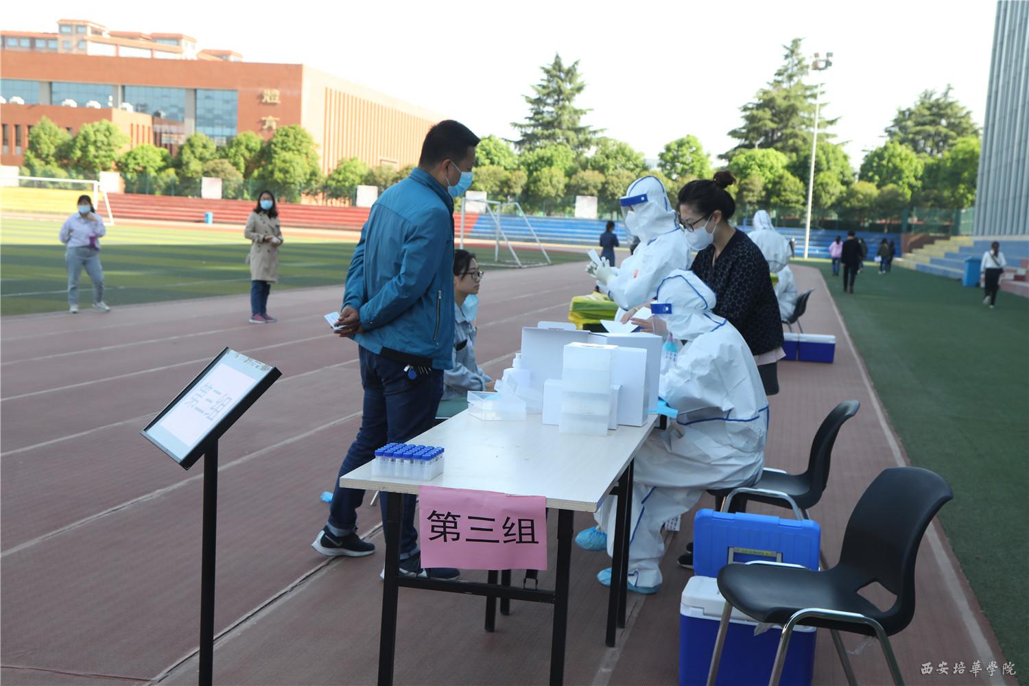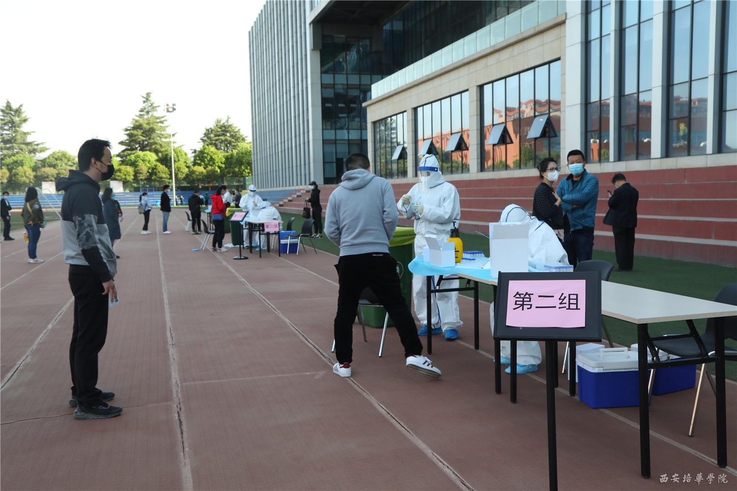 4月26日清晨,西安培华学院长安校区操场上人流不断,200余名教职工间隔1.5米的距离排队等候检测。根据省市教育部门相关要求,西安培华学院将在4月27号、5月7号到5月14号,迎来今年春季学期学生返校。为了提供安全健康的校园环境、保障全校师生员工的个人健康,学校为2万4千名师生员工全部免费提供核酸检测,所有人员返校都需率先进行核酸检测。今天,1500名多后勤人员、行政人员及部分教师,分批在该校长安校区进行核酸检测,为迎接明天首批返校学生做好准备。