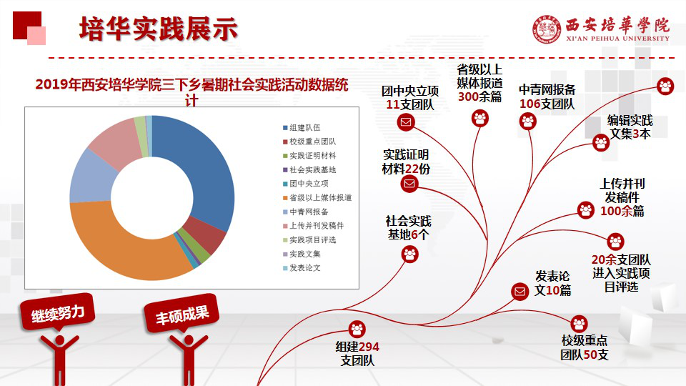 --媒体宣传引导,凝练培华实践成果。多方联动,积极宣传,今年我校暑期实践国家、省市县地区报道共计300余次,包括人民网、新华网、中国青年网、中青在线、陕西省教育厅、陕西共青团官网等传统权威媒体报道共计100余次,在中青网报备团队数达到106个,上传并刊发的实践报告、感悟收获、实践纪实等稿件多达100篇。20多个项目进入团中央“镜头下的三下乡”、“千校千项”等实践项目评选。编印了《2019年西安培华学院暑期“三下乡”社会实践·“一路心语”心得体会文集》、《2019年西安培华学院暑期“三下乡”社会实践·媒体报道风采集》、《2019年西安培华学院暑期“三下乡”社会实践·风采集》三本实践成果集,300支团队形成社会实践日志、心得体会共计1000余篇。