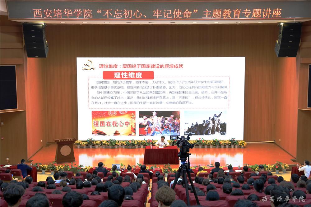 9月27日下午,西安培华学院党委书记胡俊生在维之图书馆报告厅为2019级新生进行爱国主义教育专题讲座,阐述“青年爱国的三个认知维度”。党委宣传部部长柳雨主持讲座,500余名新生聆听讲座。