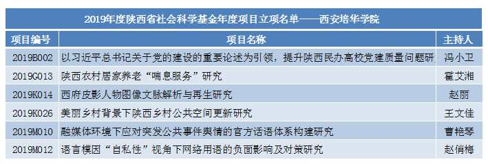 9月11日,陕西省哲学社会科学工作办公室公布2019年陕西省社科基金年度项目立项名单,西安培华学院本年度共申报60项,获立项6项,立项率为10%,申报数量与立项数量均创历史新高,且立项数量位居全省民办院校第一位。