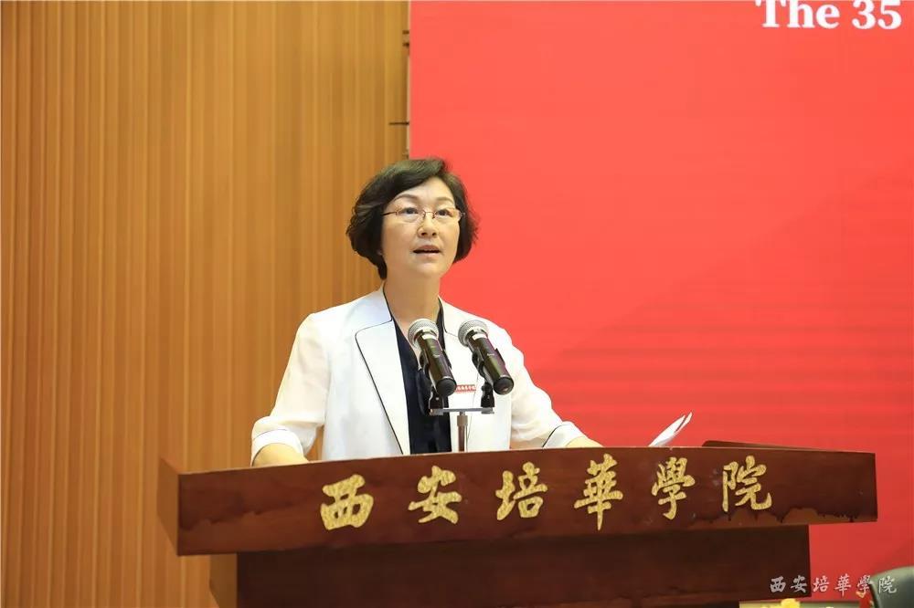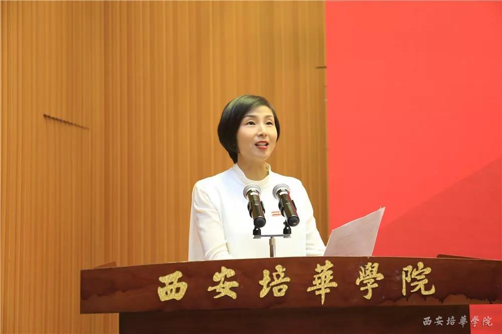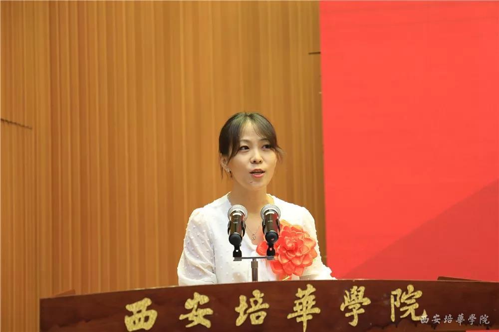 陕西省优秀教师、传媒学院杜萍副教授作为优秀教师代表发言。她提到,在培华从教20年,自己的青春已经和培华连在一起。看着一届届学生入校、毕业、工作、有自己的家,他们带着培华的期许和精神不断努力,勇敢地成长。每当知道他们的成绩与进步、收到他们的问候与关心,自己就觉得作为一名教师,好幸福!她表示,教育是个清苦的行业,教师是个辛苦的群体,但同时,教书是严肃的,讲台是神圣的,既然选择了教育,就需要静下心来,心无旁骛,为学生负责,为学生家长的期许负责,也是为社会负责。