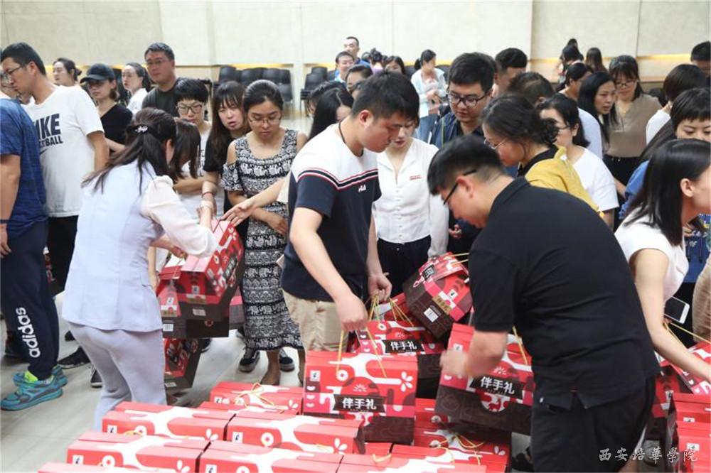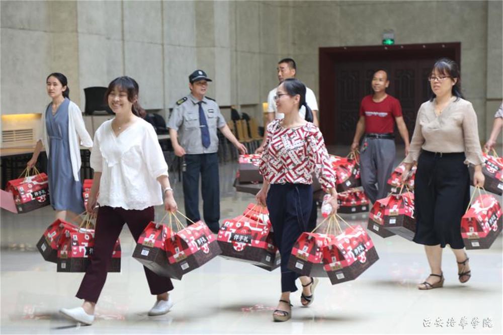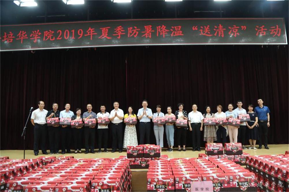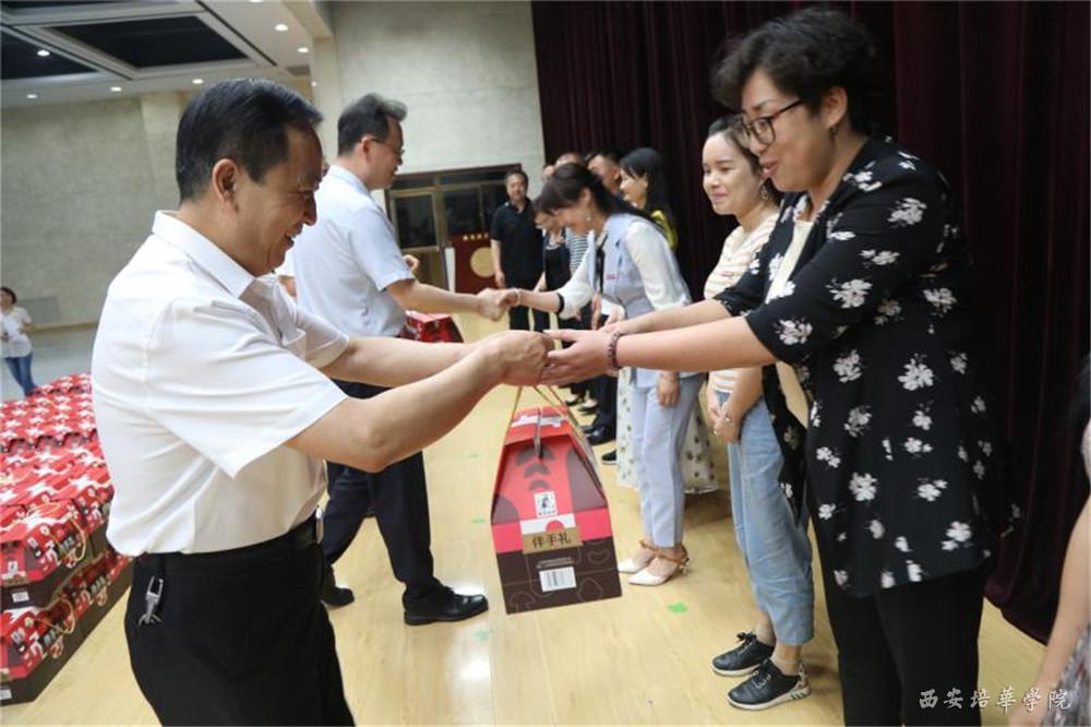 理事长及校领导为教职工代表发放“送清凉”慰问品。
