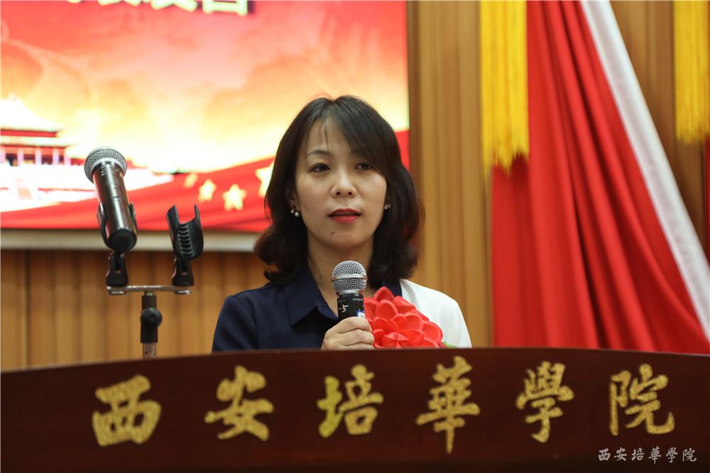 优秀共产党员代表,传媒学院教师杜萍发言,她讲道,在19年的教师党员生涯中,她始终坚持“一棵树影响另一棵树,一朵云推动另一朵云,一个灵魂唤醒另一个灵魂”的教育理念。她表示,此次荣获表彰,离不开党组织的栽培和各位同志的帮助,今后将珍惜荣誉,谦虚谨慎,争取在平凡的岗位上做出更大的成绩。