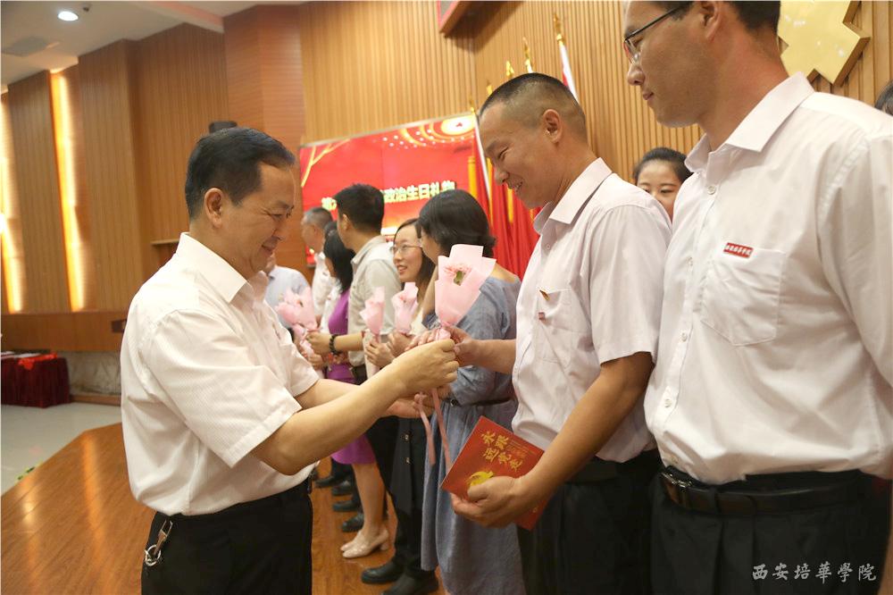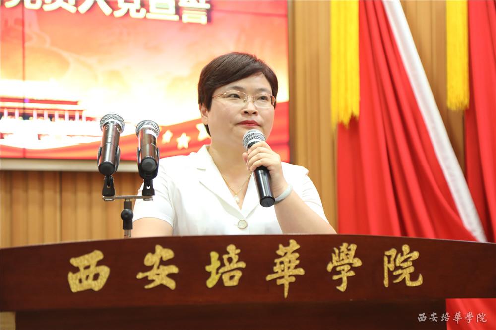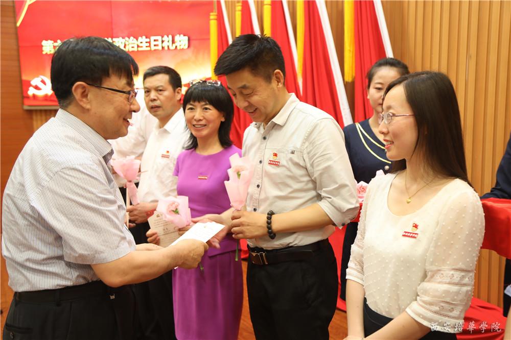 党委副书记、副校长姚文静为新党员代表佩戴党徽、发《党章》。党委书记胡俊生、校长李映方为7月、8月份入党的党员过“政治生日”,送上“生日贺卡”和祝福。