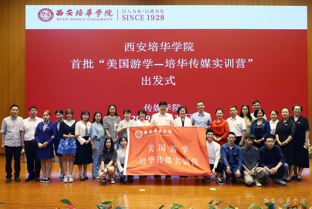 西安培华学院传媒学院首批“美国游学—培华传媒实训营”将于2019年6月24日至7月6日前往美国纽约电影学院洛杉矶分校进行短期访学交流,为鼓励首批美国游学实训营师生,营造热烈良好的学习氛围,进一步推动学院国际化工作,传媒学院于2019年6月20日下午在维之图书馆报告厅举行了西安培华学院传媒学院首批“美国游学-培华传媒实训营”出发式。西安培华学院副校长刘越莲、国际交流中心主任王鹏、传媒学院院长杜耀峰、传媒学院常务副院长王西娅、传媒学院党总支书记江俊瑞、传媒学院副院长赵伟、院长助理张荣花、传媒学院全体教师、实训营团队成员、传媒学院大一、大二全体学生出席和见证此次出发式。