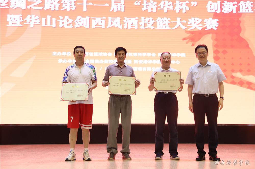 闭幕式最后,特聘请陕西省篮球协会副主席魏安、赵西斌;陕西省篮球协会艺术总监刘继红为西安培华学院客座教授。西安培华学院理事长姜波博士亲自为三位客座教授颁发聘书,同时,三位客座教授也为姜波理事长馈赠墨宝。