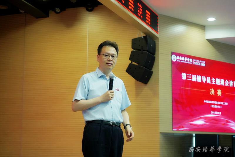 理事长姜波博士为大赛致辞,他对12名脱颖而出进入总决赛的选手表示祝贺,他指出,辅导员既是学生思想的引领者,也是他们的心灵导师;大学生是一个独立的个体,也是班级团队中的一员。辅导员主题班会讲课大赛的举办,强化了学生对班级的感知,促进了师生关系的回归,提高了辅导员的认识,时刻提醒他们要以服务学生为出发点、切入点和落脚点。他强调,今天的主题班会同时也是传道授业解惑的过程,在建国70周年,希望同学们能够重新认知今天的大学、了解自身所肩负的责任,创造有益的社会价值,培华学子应学好真本领,开好每一堂主题班会。
