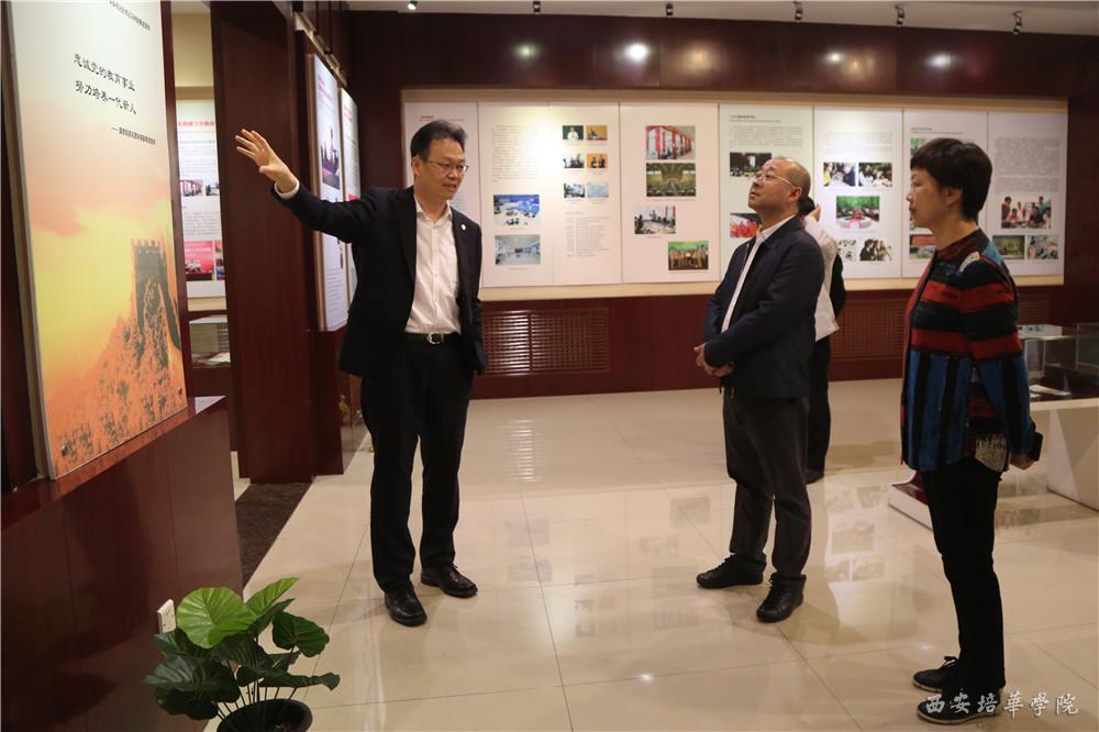 王青峰一行在姜波的引导下,察看了培华学院教学环境,并进入维之图书馆,详细参观了校史馆,了解了西安培华学院的历史、基本概况、发展建设情况。