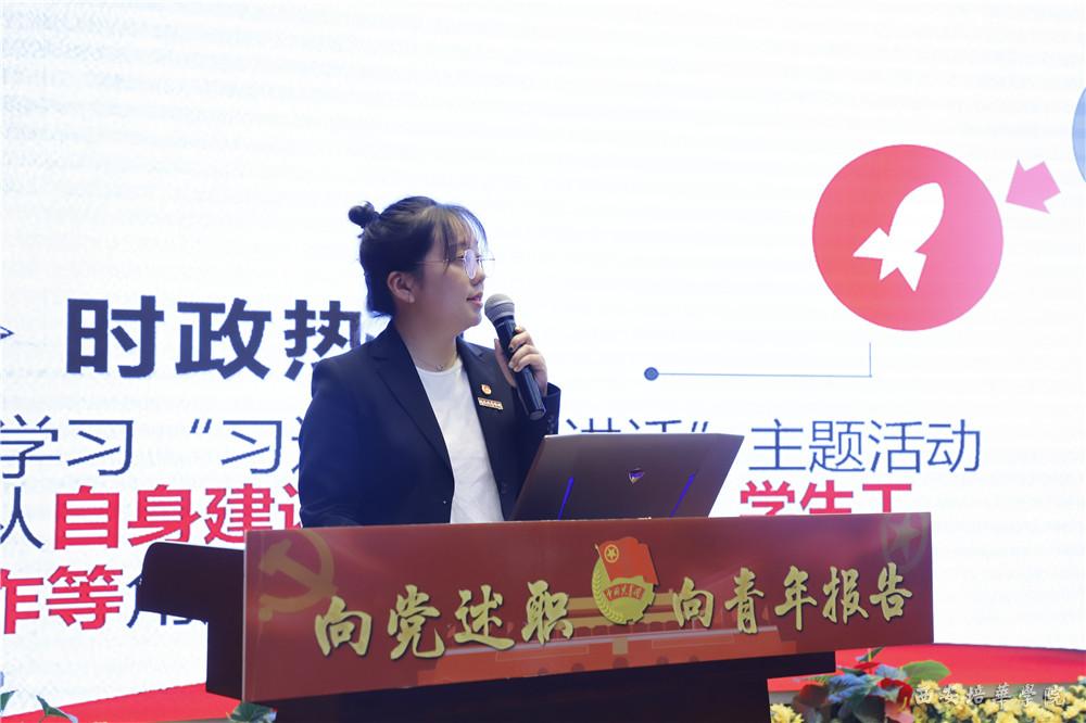 医学院团委书记董莹从“政治性铸魂,脚踏实地引领思想;先进性固身,行胜于言从严治团;实际性强基,志愿服务反哺学生;融合性育人,第二课堂深入发力”为出发介绍了医学院的重点工作,锐意进取,奋发有为,结合医学院特色团学工作,向大家展现出近一年的共青团风采。