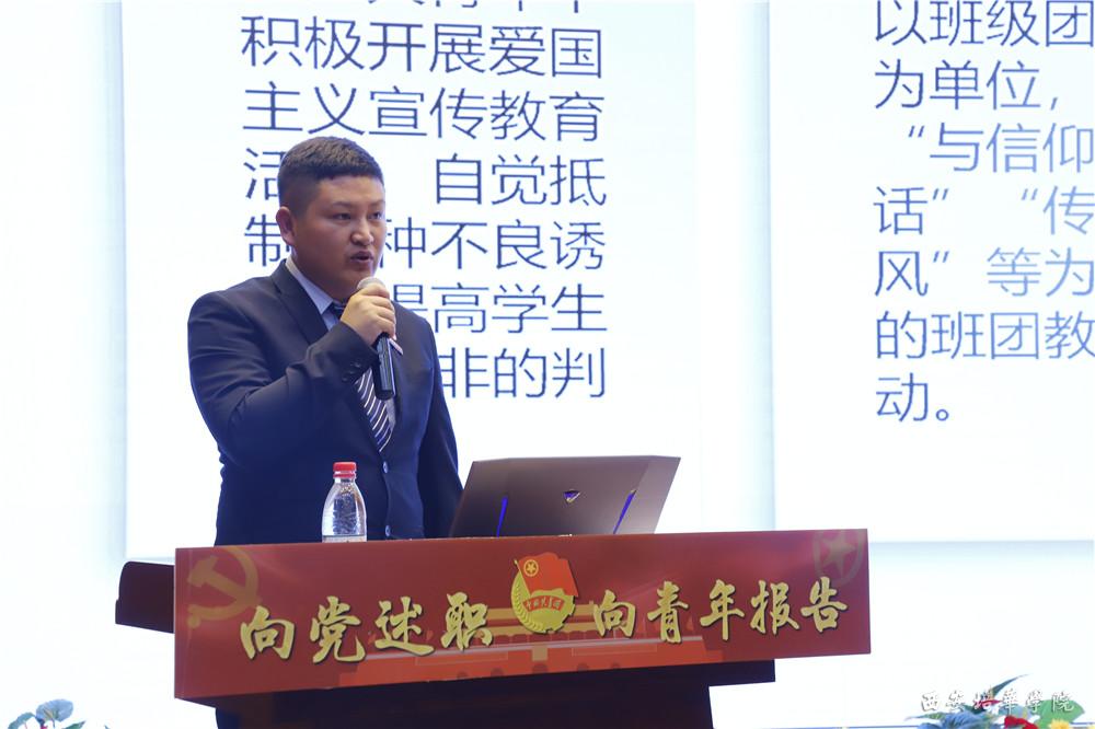 会计与金融学院团委书记王冰以团、学、青、专业社团为依托,讲述了该院“三鼎”共青团工作方针,即“金鼎”学科助推学风建设、“银鼎”第二课堂育人平台、“玉鼎”实践服务育人体系。她介绍了思想引领的有效举措、从严治团的有效办法、社会实践和志愿服务工作成果,生动的展示了学院共青团工作的新成果。