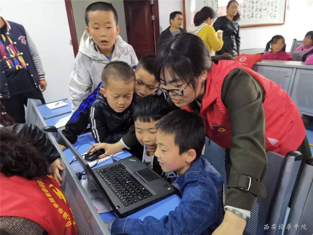 教工党员志愿服务队的老师们利用随身携带笔记本电脑帮助小朋友们绘制出他们对未来的想象。大家围坐在老师周围,一双双对知识渴望的眼睛透彻清莹,一张张稚嫩可爱的笑脸展现出未来的向往。老师们悉心指导,与同学们畅想着对未来的美好愿景。
