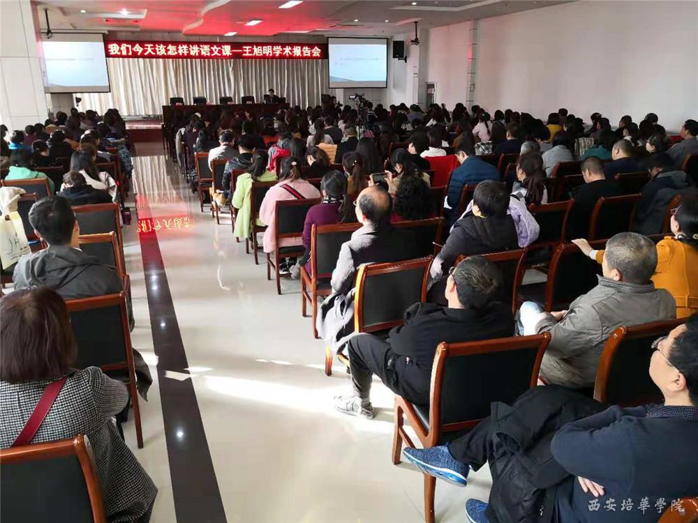 为了进一步推动“双百工程”,提升金台区中小学语文教师的专业素质,我校特邀请教育部原新闻发言人,语文出版社社长王旭明教授于11月22日下午在金台市民中心14楼会议室进行了西安培华学院教育扶贫师资培训项目之一:《今天,我们该怎样上语文课》学术报告会。金台区各中小学领导、语文骨干教师及金台区教研室教研员约300人参加此次学术报告会。我校党委书记胡俊生,宝鸡市教研室主任沈宏军,金台区教育体育局副局长陈雅琴出席了会议。