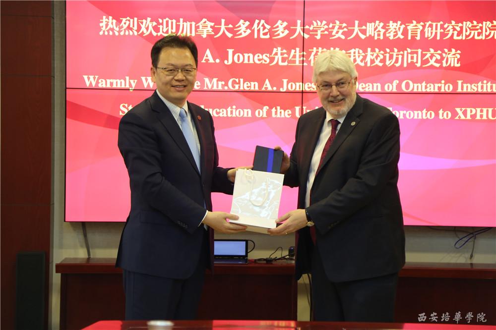 姜波理事长、刘越莲副校长、国际交流中心主任王鹏与来宾在理事长办公室进行了座谈交流。座谈会上姜波理事长首先表达了对安大略教育研究院院长Glen A. Jones一行的热烈欢迎及衷心感谢,并向来宾介绍了我校办学历史、办学方针、办学成果等,着重介绍了我校“地方性、应用型、国际化”的办学定位和国际化教育建设成果。中国国际教育电视台台长李世强向我校参会人员介绍了加拿大多伦多大学的学校概况,对于到培华交流访问表示荣幸。Glen A. Jones院长感谢了姜波理事长的接待和介绍,表示愿与培华建立合作、共同推动两校国际化教育建设。