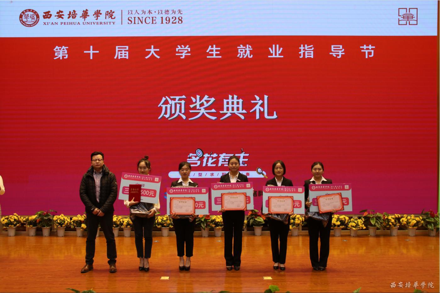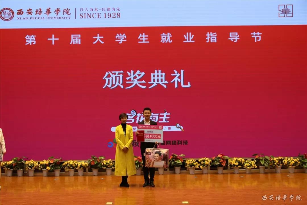58同城西安站市场部经理刘腾飞,招生与就业指导中心副主任王琳为获得“最佳网络人气奖”的选手颁奖