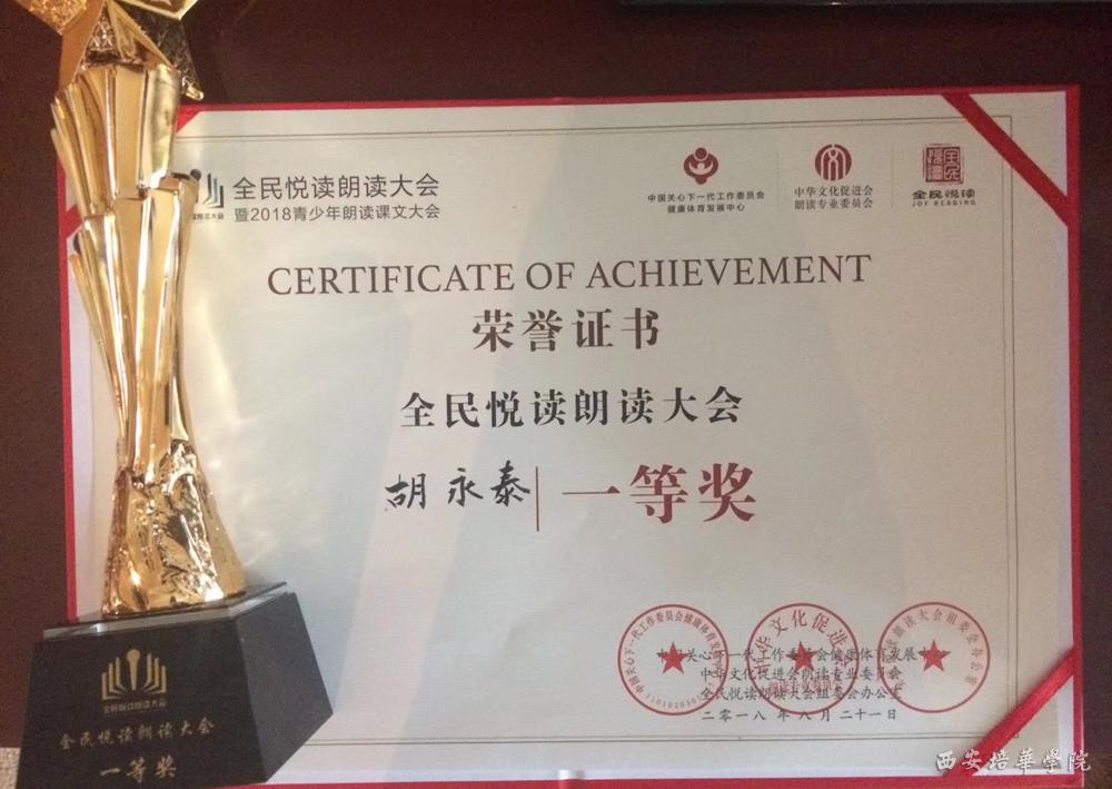 全民悦读朗读大会暨2018青少年朗读课文大会半决选及总决选于8月19-21日在北京举行。央视主持任志宏、配音大师孙悦斌、著名演员于月仙、著名表演艺术家斯琴高娃领衔近百名专家评委为获奖选手见证,进行表彰。我校2015级播音与主持艺术专业学生胡永泰经过激烈的角逐,荣获高校组一等奖。