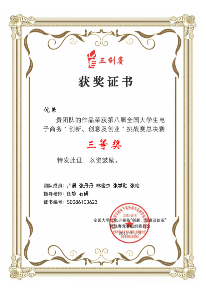 在校赛中,他们的新颖项目得到了校领导的认可,成功进入省赛。进入省赛后的他们一刻也没有松懈,继续完善项目,在省赛中成功拿到取得省级三创比赛一等奖的荣誉。他们带着省级一等奖的荣誉参加国家总决赛,最终荣获“全国大学生三创比赛三等奖”。