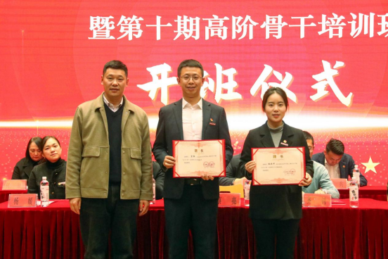 云梯青年学校校长、校团委书记杨媛为第十七期“青马工程”团支部书记(班长)培训班暨第十期高阶骨干培训班团建学长黄家驹授旗。