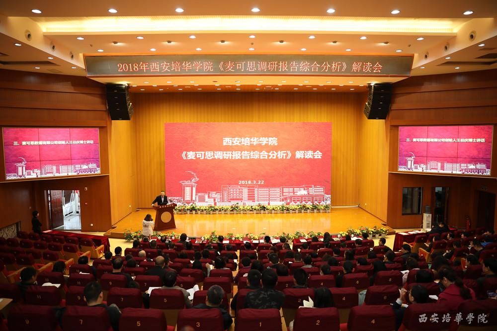 3月22日,麦可思公司总裁、麦可思研究院院长王伯庆博士,麦可思公司副总裁、麦可思研究院副院长,高等教育质量评价专家周凌波博士一行来到我校,在维之图书馆报告厅做了《麦可思调研报告综合分析》的解读报告会,陕西省政协常委、致公党陕西省委员会副主委、我校理事长姜波博士、校长李映方等学校领导、各院(部)、中心负责人及各专业带头人一起聆听了报告会。报告会由副校长姚文静主持。