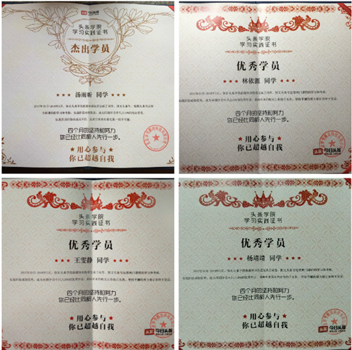新学期第一周,我校新闻学专业汤雨昕等同学就拿到了头条学院新媒体训练营的优秀学员实践证书,这意味着在过去132天的实战练习中,他们的努力得到了头条学院新媒体训练营的肯定。