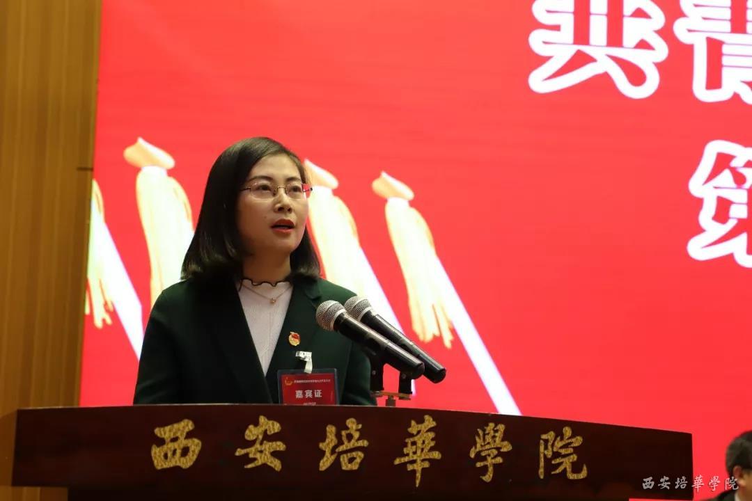 西安培华学院党委副书记、副校长姚文静同志宣读西安培华学院理事长姜波贺词、全国民办高校(独立学院)共青团工作联盟秘书处贺信