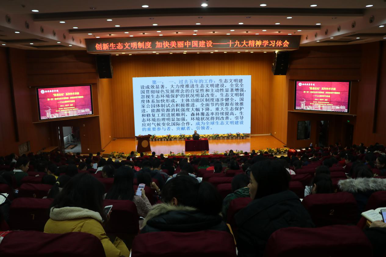 12月1日,十九大宣讲团成员、陕西师范大学人文地理学学科带头人延军平博士在我校进行了《创新生态文明制度,加快美丽中国建设》——十九大学习体会报告会。我校各党总支书记、党务干事、党支部书记、教师和学生党员代表500余人参加了报告会。