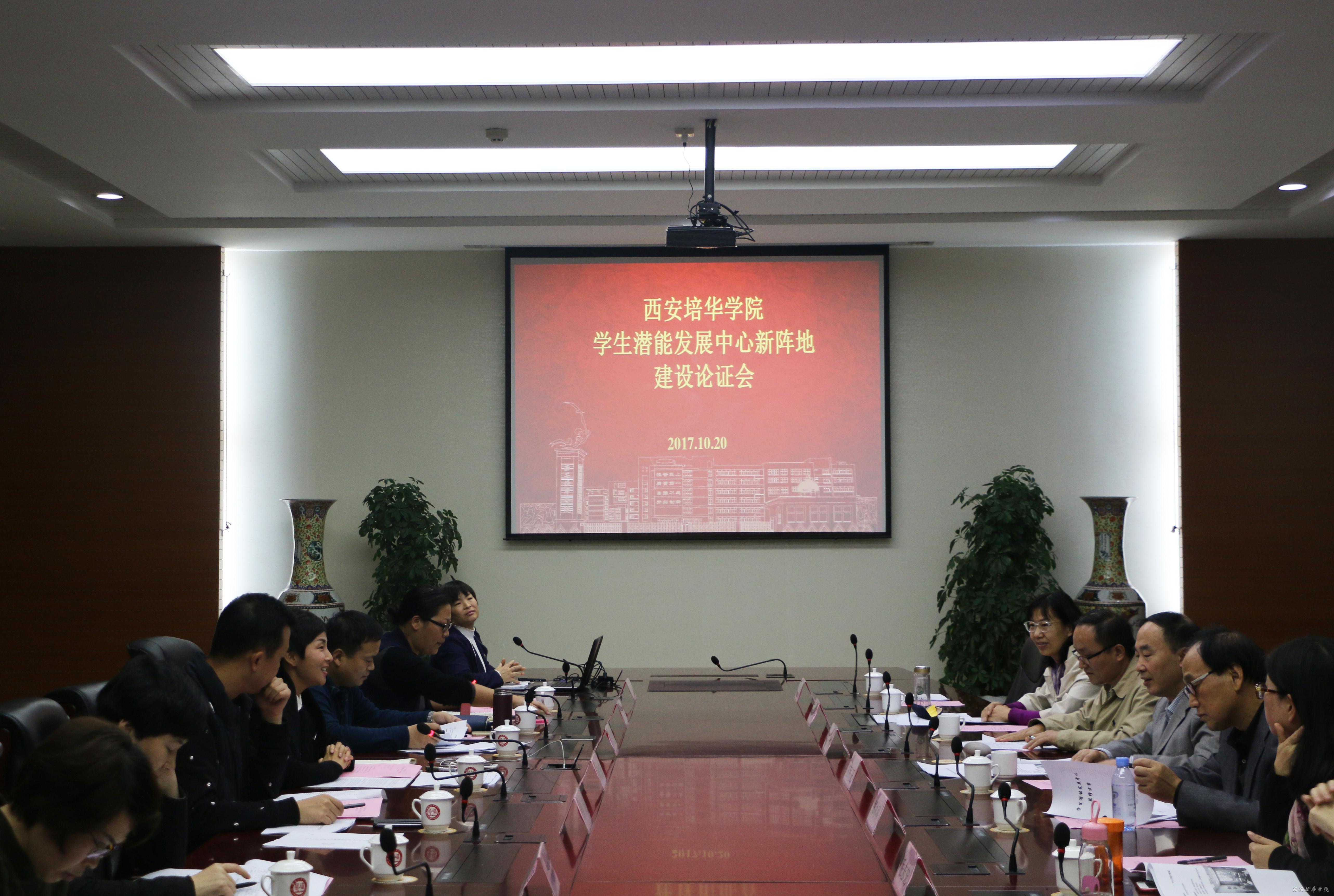为加强我校大学生心理健康水平和生涯规划能力,实现学生的自我潜能开发,在我校领导的高度支持与关注下,加速推进学生潜能发展新中心的建设筹备工作,2017年10月20日下午2点,西安培华学院学生潜能发展中心新阵地建设论证会在明德楼第一会议室召开。
