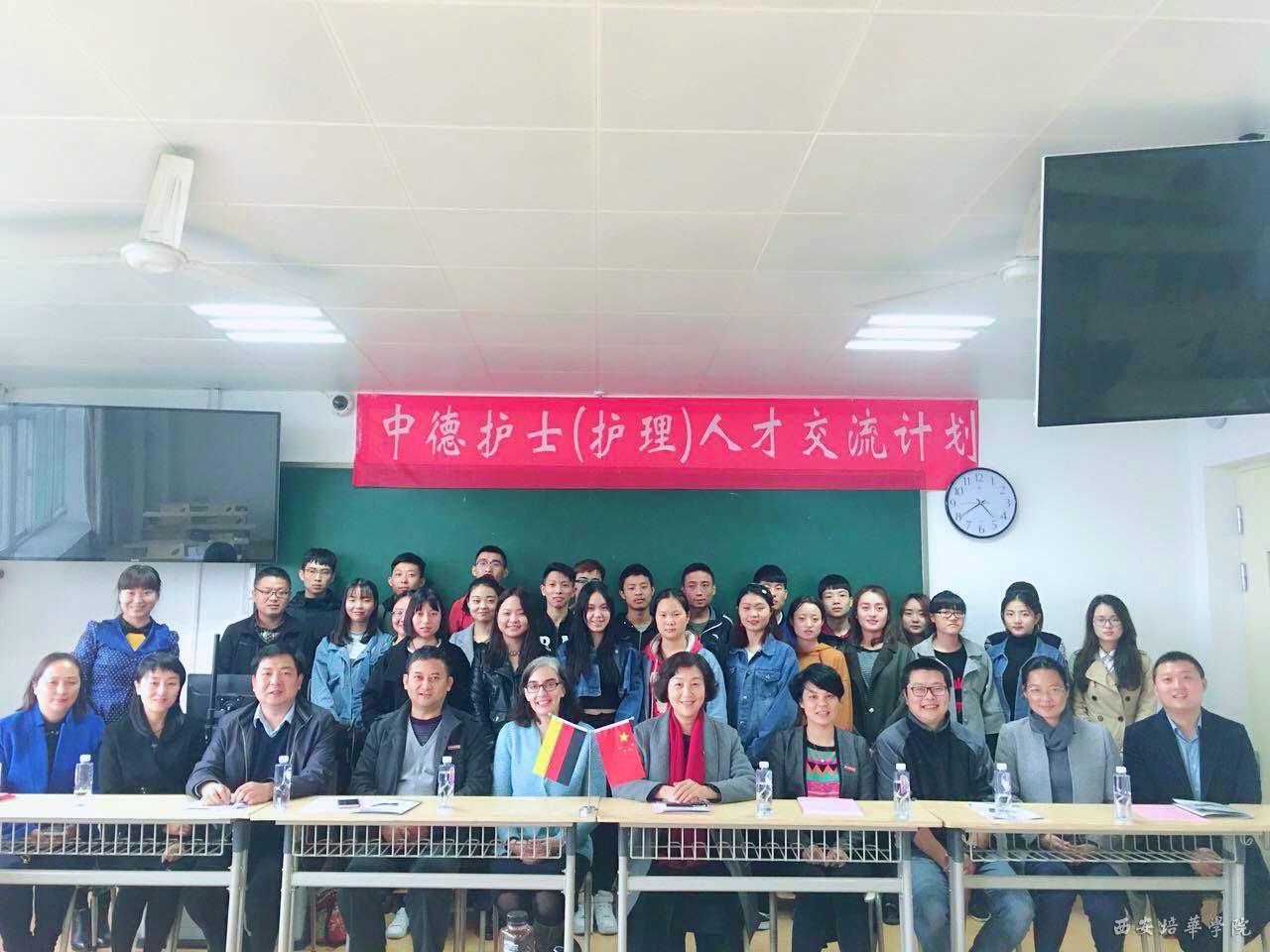 席小武院长介绍了西安培华学院发展情况以及中德护理人才交流项目从联系、签订、实施等一系列过程性工作的进展;刘越莲副校长用5个德语单词“规划、专业、方法、兴趣、认真”展开了讲话,动员学员们要珍惜这份难得的学习机会,努力提升德语水平,顺利通过语言考核,并通过赴德学习工作实现自身职业规划报效国家;Carola Krueger女士讲述了自己来中国的学习和工作经历,启发了同学们努力学习德语的决心,学会感恩,学会爱国。