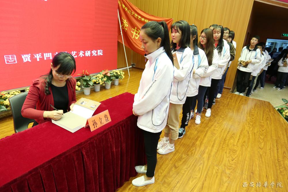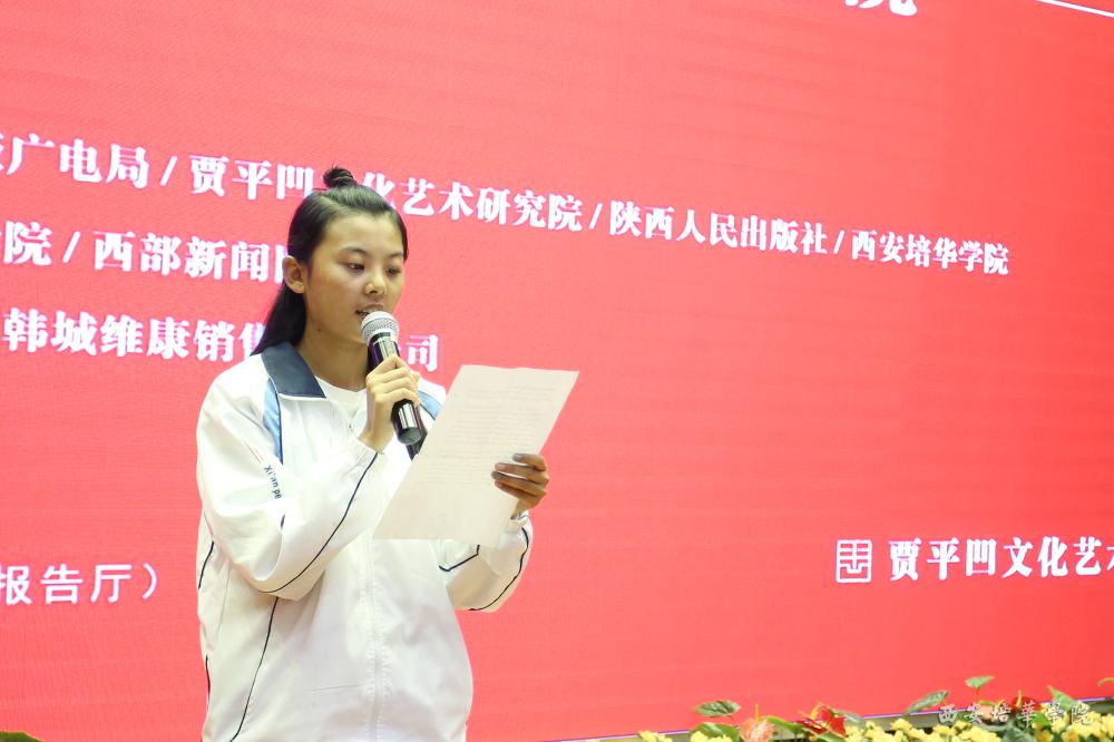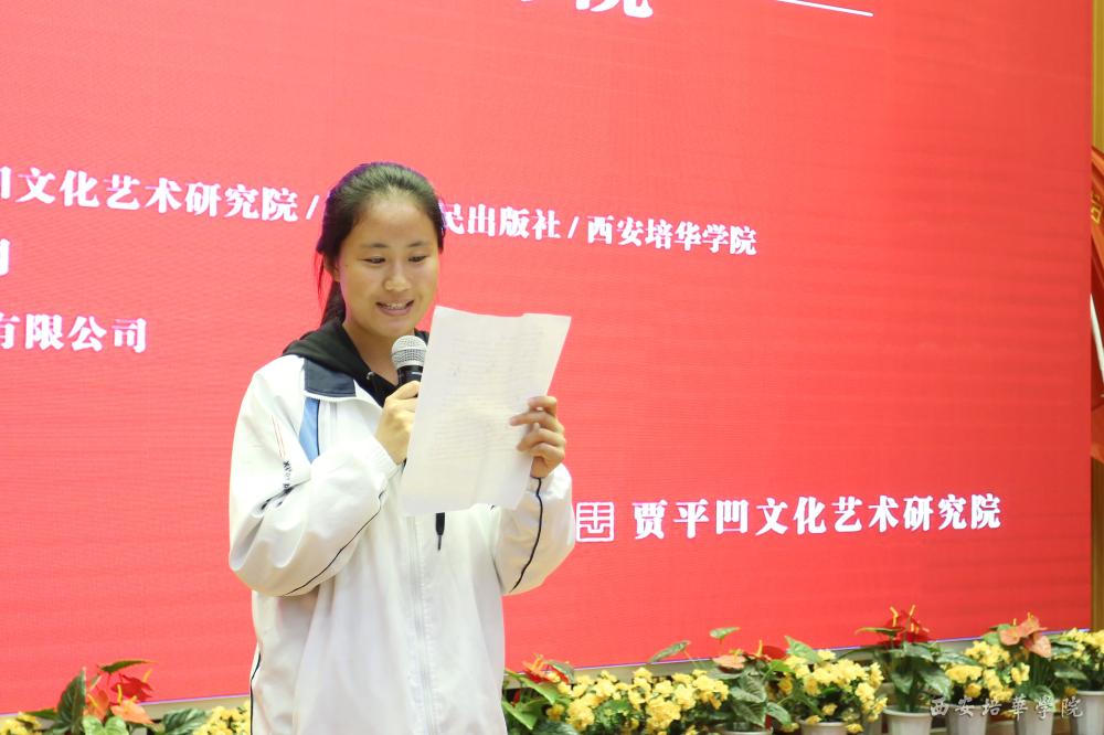 活动中,陕西人民出版社、西安志宽食品有限公司向我校图书馆赠书,我校三名学生分别上台朗诵了贾平凹作品《秦腔》、陈忠实作品《白鹿原》、路遥作品《平凡的世界》摘录出的精彩片段。