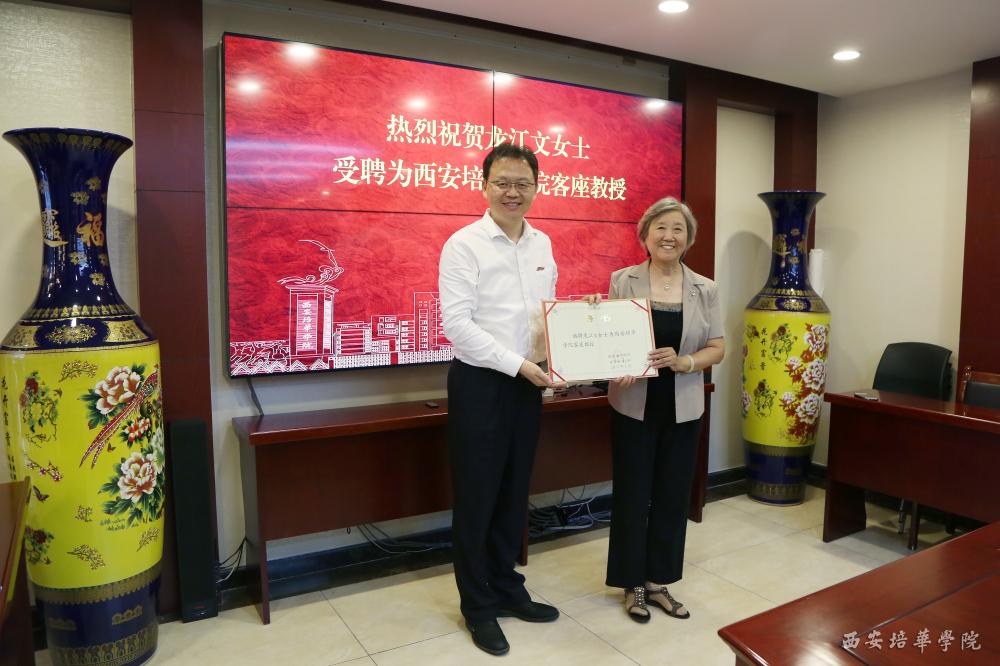随后,双方在明德楼会议室交流座谈,学校理事长向中国民促会常务理事龙江文女士颁发了客座教授聘书。中国民促会常务理事龙江文女士表示,培华的发展让她很震撼,学校的校园校区很大、环境非常优美;学校特色鲜明,办学历史积淀深厚、办学理念先进,现在已经进入快速发展时期。她强调,大学是培养人的品格,为国家培育栋梁之才的关键时期,自己愿意向姜维之老校长学习,将学到的知识贡献出来,为培华教育事业发展贡献力量。中华女子学院副院长刘梦女士表示,培华学院如今办学成果丰硕,办学定位特别准确,希望将来可以与培华学院在研究项目、专业建设、学院建设、师资培养等方面展开合作。