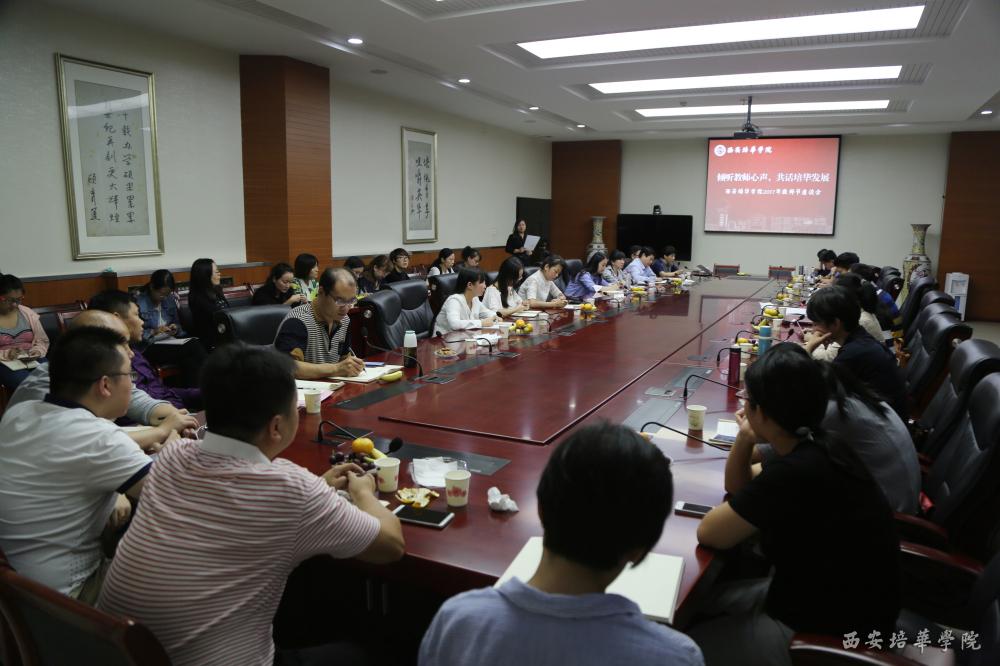 2017年9月10日是我国第33个教师节,为倾听广大教师对学校建设的意见建议,做好教师的思想工作,帮助解决实际困难和问题,9月7日下午,我校在明德楼第一会议室召开教师节系列活动之教师座谈会,李映方副校长与学校各二级学院、职能部门(中心)教师代表亲切座谈,向全校教师及教育工作者致以节日的问候,并亲切询问了教师代表在工作中遇到的问题,倾听教师们对学校发展提出的意见,现场给与指导和建议。教师代表们积极讨论,相互学习教学育人经验,为学校发展建言献策,现场氛围温暖热烈。