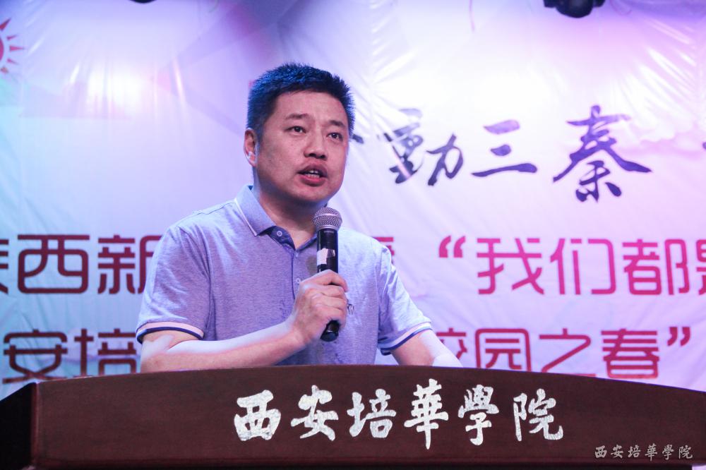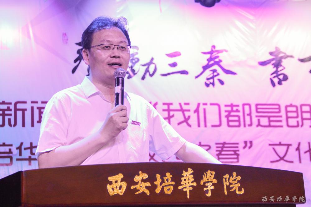 陕西新闻广播总监付银安表示,此次由陕西广播电视台新闻广播、陕西省作家协会创联部、西安培华学院联合主办的“声动三秦•书香你我”陕西新闻广播“我们都是朗读者”系列活动,就是要让我们与书为友,以书为鉴,点燃读书激情,营造书香文化校园。他真诚的希望同学们能够选择优秀的作品,打开自己的心扉,用最美的声音表达情感,树立自信,不断提升,实现人生理想!