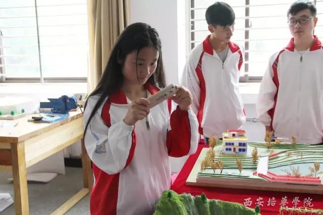 瞧,在建筑工程实验教学中心,高三学生们纷纷掏出手机,拍下学长学姐的作品,他们说:“学姐学长太有才了,设计的模型太好看了。”