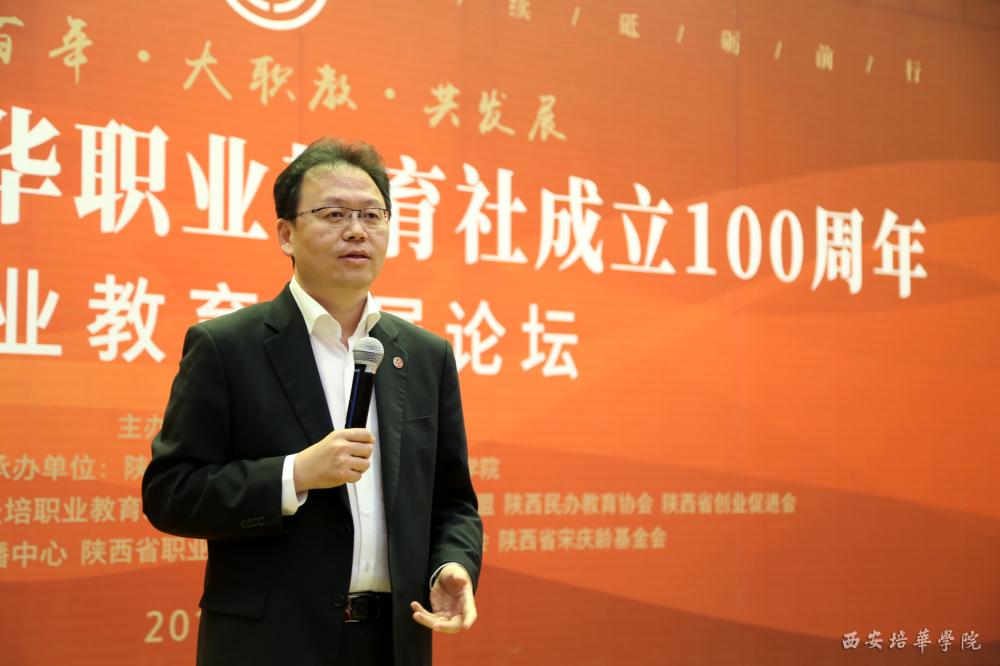 我校姜波理事长以“践行黄炎培职教思想 加快高等职业教育发展”为题作发言,他表示“培华”的校名,秉承了黄炎培“手脑并用,双手万能”的职业教育思想,取中华职业教育社主要创办人黄炎培先生之“培”和中华职业教育社之名“华”字,意在强调“培土育华,基础之巩固,前途之发展”的教育理念,培华同时也是中华职业职业教育社陕西设立的唯一分校。
