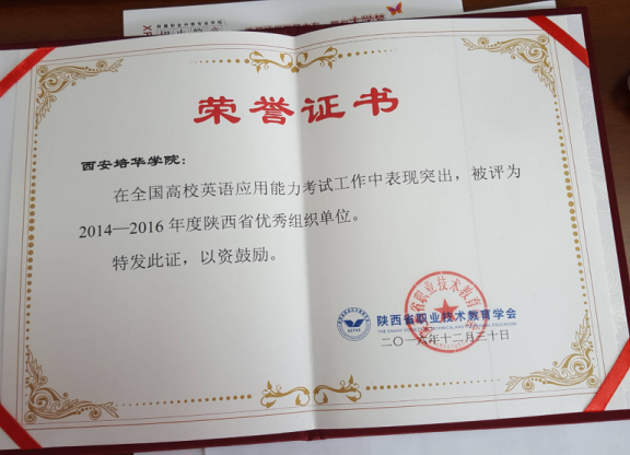 为进一步做好英语应用能力考试的各项管理组织工作,表彰先进,激发考务人员工作的积极性,陕西省职业技术教育学会特举办关于陕西省英语应用能力考试评优活动。我校在考试组织中未曾出现失误,试卷安全保密工作及考风考纪良好,荣获陕西省优秀组织单位。